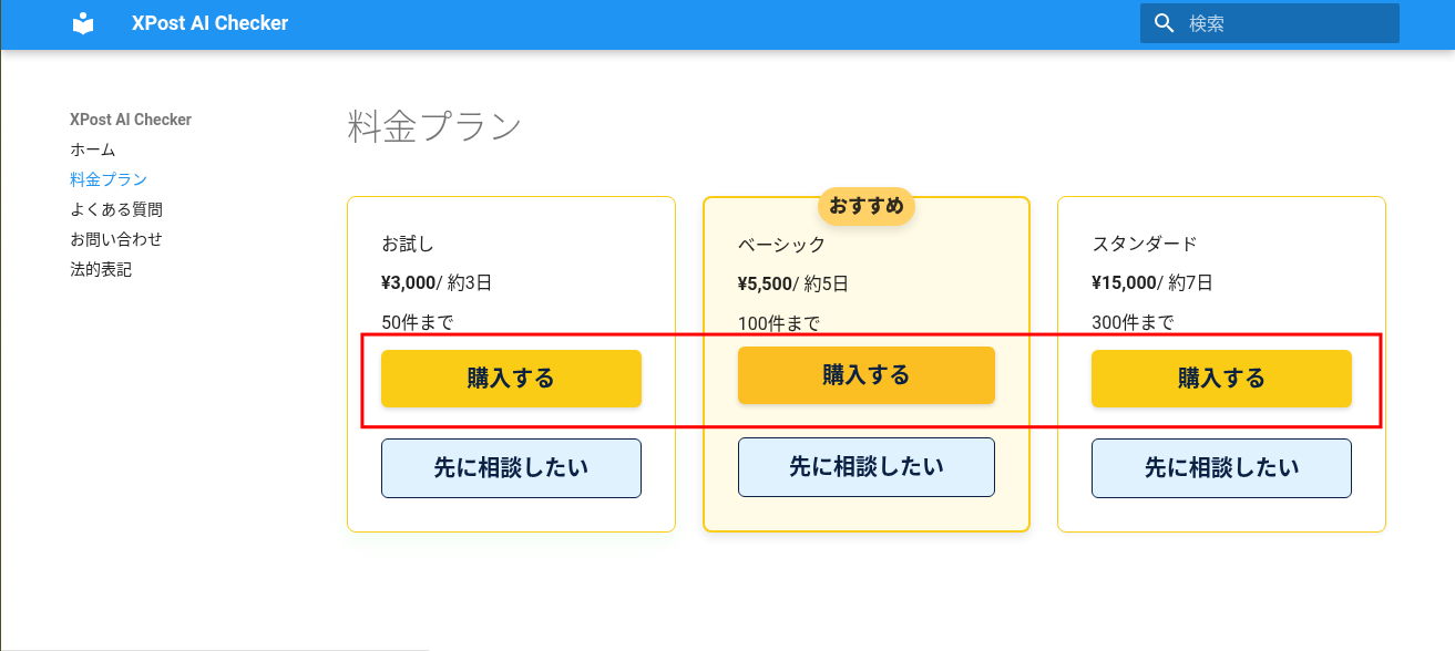 ご希望のプランの「購入する」ボタンからお支払いください。