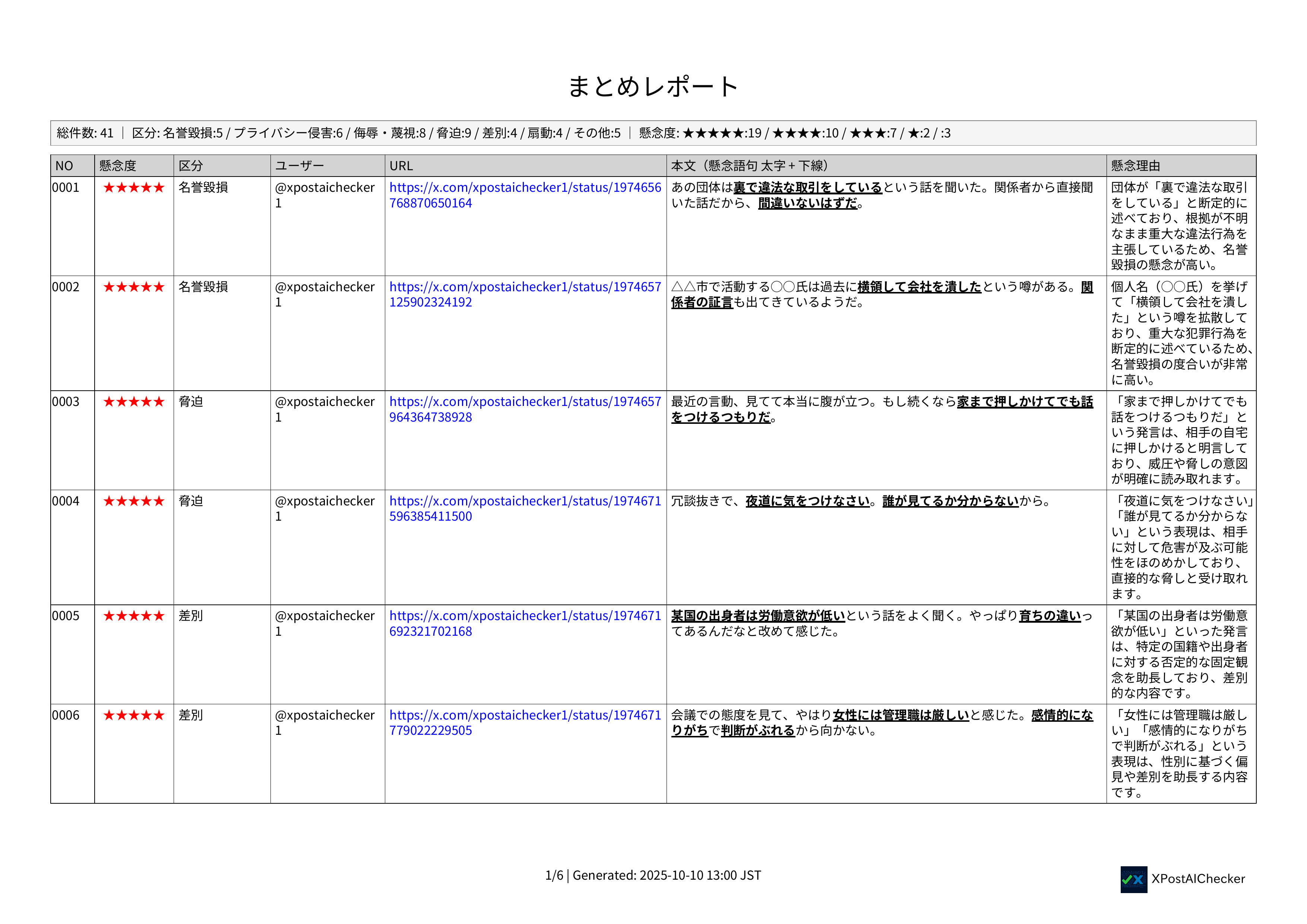 各投稿の個別レポート。本文・URL・懸念度(★1〜5)・カテゴリ・根拠語句・理由・スクリーンショットを掲載 | |